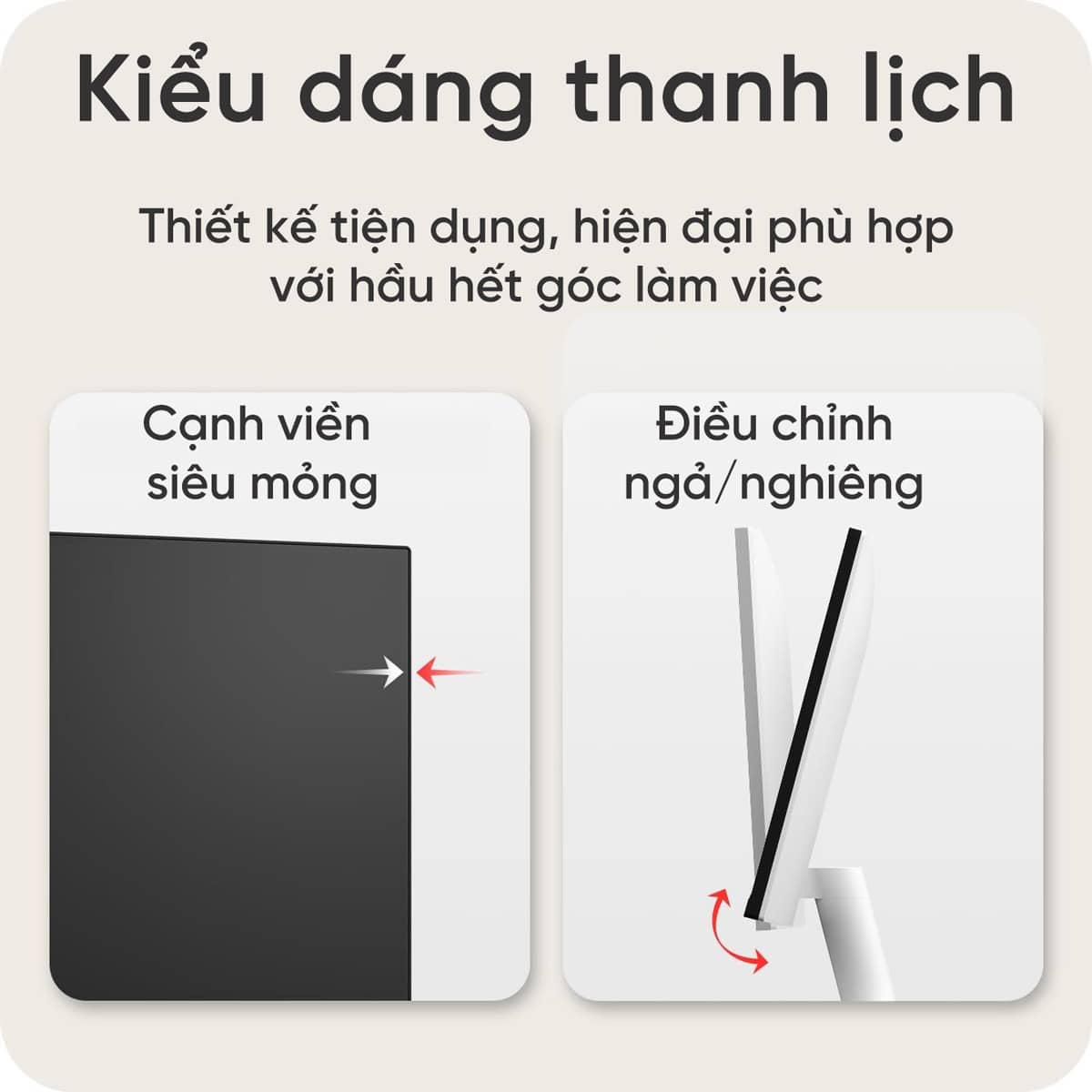 Màn hình LG 27US500-W sở hữu thiết kế đơn giản nhưng không kém phần sang trọng với tông màu trắng trang nhã. Viền màn hình siêu mỏng giúp tăng tối đa diện tích hiển thị, mang đến trải nghiệm hình ảnh liền mạch và sống động. Ngoài ra, sản phẩm còn hỗ trợ chuẩn VESA, cho phép người dùng dễ dàng kết hợp với các loại chân đế hoặc tay treo màn hình khác nhau, giúp tiết kiệm không gian làm việc.