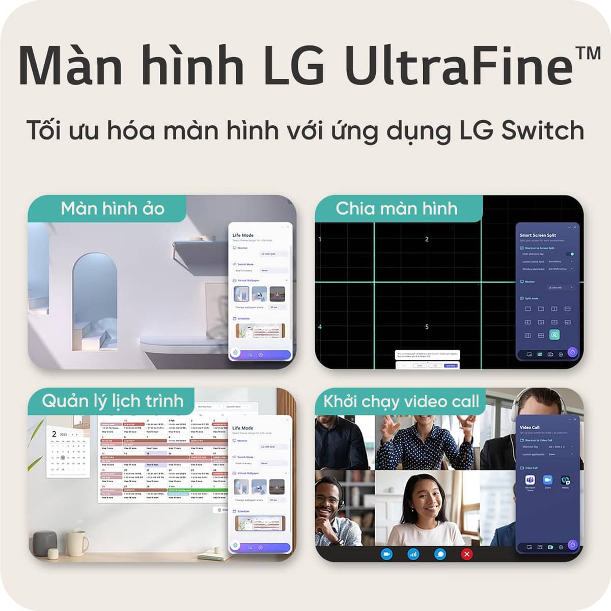 Một trong những điểm nổi bật của màn hình LG UltraFine 27US500-W là tính năng LG Switch độc đáo. Tính năng này cho phép người dùng dễ dàng chuyển đổi giữa các thiết bị đầu vào khác nhau như máy tính, laptop hay các thiết bị di động chỉ với một cú nhấp chuột. Nhờ đó, bạn có thể làm việc đa nhiệm một cách hiệu quả hơn, tăng cường năng suất làm việc.