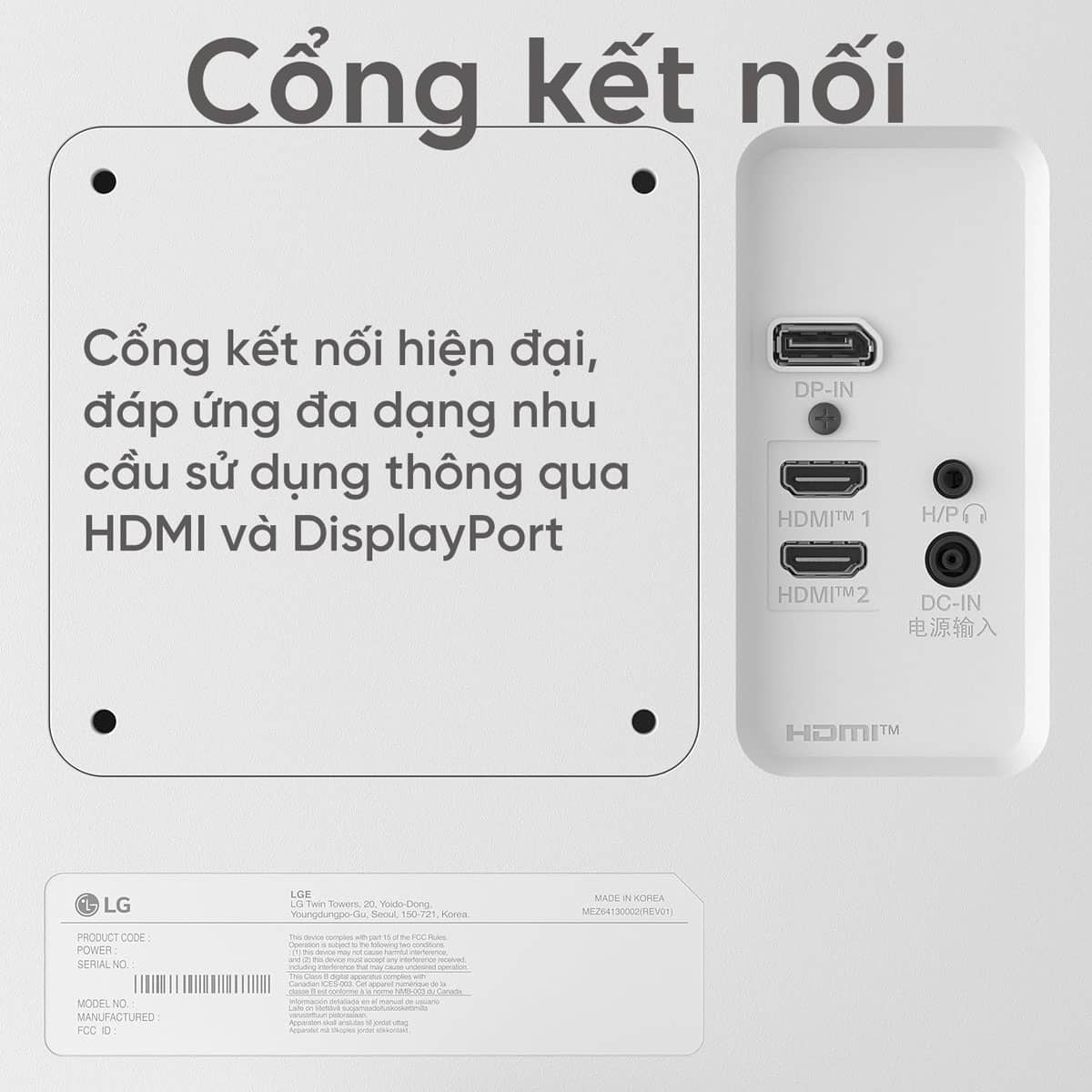 Màn hình LG 27US500-W được trang bị đầy đủ các cổng kết nối hiện đại, đáp ứng đa dạng nhu cầu sử dụng. Cổng DisplayPort với băng thông cao gấp nhiều lần so với HDMI, mang đến trải nghiệm hình ảnh 4K sắc nét và mượt mà, đặc biệt phù hợp với các tác vụ đồ họa chuyên nghiệp. Cổng HDMI linh hoạt, hỗ trợ nhiều định dạng video và âm thanh, cho phép kết nối với nhiều thiết bị khác nhau. Ngoài ra, cổng âm thanh 3.5mm giúp bạn dễ dàng thưởng thức âm thanh chất lượng cao.