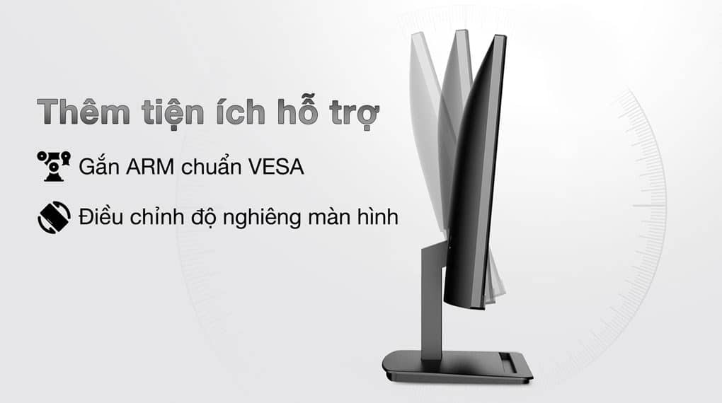 Chân đế chỉ dừng lại ở các chế độ ngả nghiêng cơ bản, vẫn có thể mang tới cảm giác trải nghiệm trọn vẹn. Mặt sau hỗ trợ ngàm treo màn hình tiêu chuẩn VESA 75x75m, giúp màn hình linh hoạt trong việc tối ưu không gian sử dụng.
