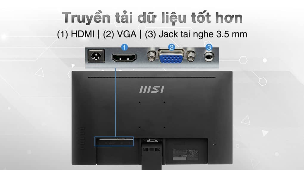 Hỗ trợ các kết nối đa dạng bao gồm HDMI, VGA và cổng âm thanh 3.5mm. Với những tính năng và thiết kế tiện dụng, màn hình MSI PRO MP223 là một lựa chọn tốt cho những người sử dụng cần một sản phẩm màn hình chất lượng với mức giá phải chăng.