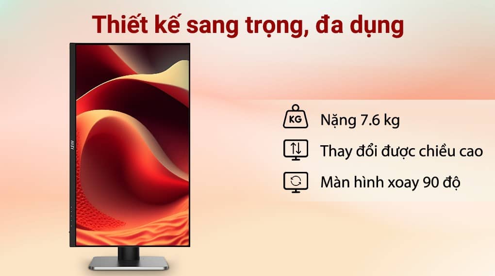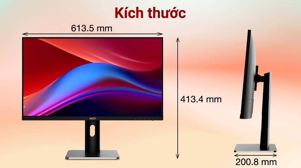Màn hình MSI PRO MP273QP có trọng lượng tổng thể 7.6kg cùng kích thước rộng 61.3 cm, cao 41.3 cm. Dù chân đế được cấu thành từ nhựa nhưng vẫn tỏ rõ sự cứng cáp thiết kế gọn nhẹ, mang đến sự di động cho phép bạn di chuyển đến bất kỳ vị trí nào trên bàn làm việc hay bàn học một cách dễ dàng.