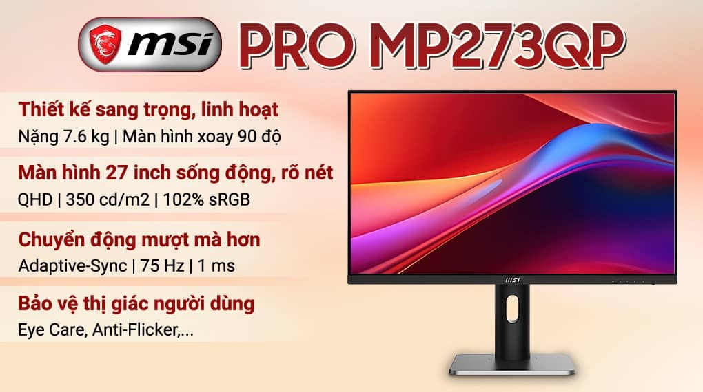 Màn hình MSI PRO MP273QP là một màn hình văn phòng đa phương tiện cao cấp, có độ phân giải QHD (1920 x 1080 pixel) và kích thước 27 inch. Nó được thiết kế để đáp ứng nhu cầu giải trí và làm việc của người dùng. Màn hỗ trợ các tính năng bảo vệ mắt khi sử dụng trong suốt thời gian dài. Chân đế hỗ trợ tùy chỉnh độ cao, xoay dọc giúp thuận tiện với tầm mắt người dùng.