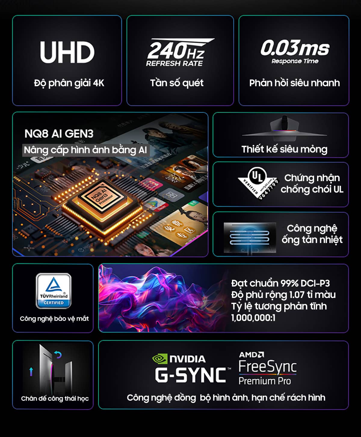 Màn hình Samsung Odyssey OLED G8 G80SD nổi bật với khả năng xử lý hình ảnh vượt trội nhờ tốc độ phản hồi siêu nhanh 0.03ms GtG và tần số quét 240Hz. Tốc độ phản hồi 0.03ms GtG giúp giảm thiểu hiện tượng bóng mờ và nhòe hình, mang lại hình ảnh rõ nét và sắc sảo ngay cả trong những cảnh chuyển động nhanh. Tần số quét 240Hz đảm bảo hình ảnh mượt mà và không bị giật, tạo ra trải nghiệm chơi game và xem phim tuyệt vời. Nhờ vào những ưu điểm này, màn hình Odyssey OLED G8 G80SD là lựa chọn lý tưởng cho các game thủ và những người yêu thích công nghệ hình ảnh cao cấp.