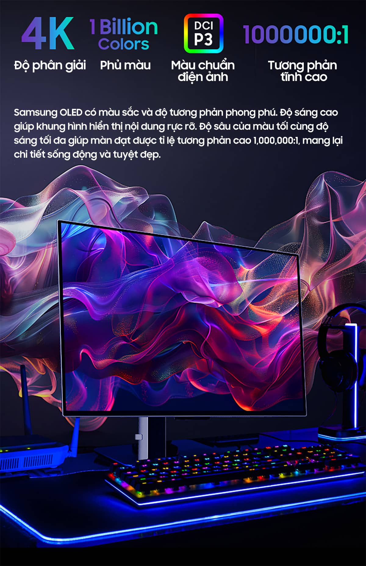 Màn hình Samsung Odyssey OLED G8 G80SD sở hữu độ phân giải 4K, mang lại hình ảnh cực kỳ sắc nét và chi tiết. Với dải màu rộng đạt tiêu chuẩn màu điện ảnh 99% DCI-P3, màn hình này tái hiện màu sắc chân thực và sống động, lý tưởng cho các công việc liên quan đến đồ họa và giải trí. Tỷ lệ tương phản cao tới 1,000,000:1 giúp hiển thị rõ ràng các chi tiết trong cả vùng sáng và tối, tạo ra trải nghiệm hình ảnh sâu sắc và ấn tượng.