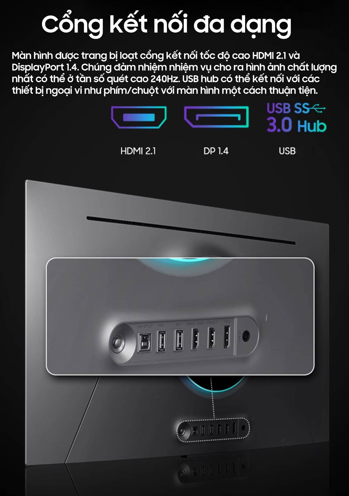 Màn hình Samsung Odyssey OLED G8 G80SD được trang bị một loạt cổng kết nối đa dụng, mang lại sự tiện lợi và linh hoạt cho người dùng. Với các cổng HDMI, DisplayPort và USB Hub, màn hình này dễ dàng kết nối với nhiều thiết bị khác nhau như máy tính, laptop, console chơi game và các thiết bị ngoại vi khác. Luôn dẫn trước đối thủ nhờ kết nối HDMI 2.1 và DisplayPort, tần số quét 240Hz ở độ phân giải UHD. Mỗi mili giây đều trở nên giá trị, giúp mang đến những kết quả tốt nhất.