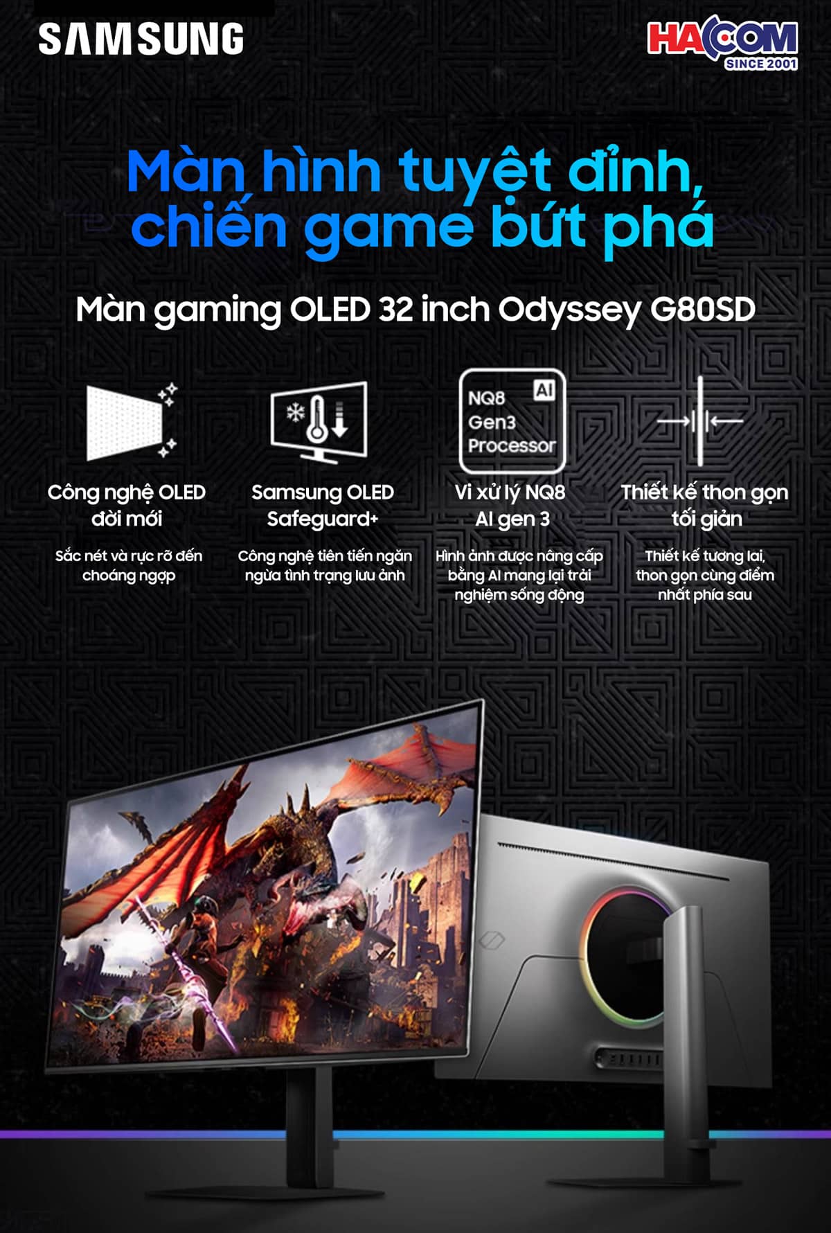 Màn hình Samsung Odyssey OLED G8 G80SD là một sản phẩm cao cấp với thiết kế hiện đại và công nghệ tiên tiến. Với kích thước 32 inch và độ phân giải 4K, màn hình này mang lại trải nghiệm hình ảnh sắc nét và sống động. Công nghệ OLED giúp hiển thị màu đen sâu và màu sắc rực rỡ, cùng với tốc độ làm mới 240Hz, đảm bảo hình ảnh mượt mà trong các trò chơi và phim ảnh. Thiết kế tạo cảm giác thon gọn, công nghệ, tăng cường trải nghiệm thị giác. Ngoài ra, màn hình còn tích hợp nhiều cổng kết nối và tính năng thông minh, phù hợp cho cả công việc và giải trí. Đây là lựa chọn lý tưởng cho những ai tìm kiếm một màn hình chất lượng cao và đa năng.
