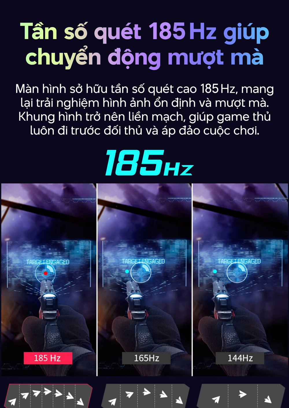 Nếu độ phân giải thỏa mãn thị giác thì tần số quét 185Hz chính là chìa khóa mở ra lợi thế cạnh tranh trong các tựa game đối kháng. Mọi chuyển động của nhân vật, từ những pha xoay người nhanh đến các tình huống giao tranh hỗn loạn, đều được tái hiện mượt mà, triệt tiêu hiện tượng xé hình hay bóng mờ. Tốc độ phản hồi 1ms (GtG) đảm bảo độ trễ tín hiệu ở mức thấp nhất, giúp mọi thao tác chuột và phím được ghi nhận tức thì trên màn hình.