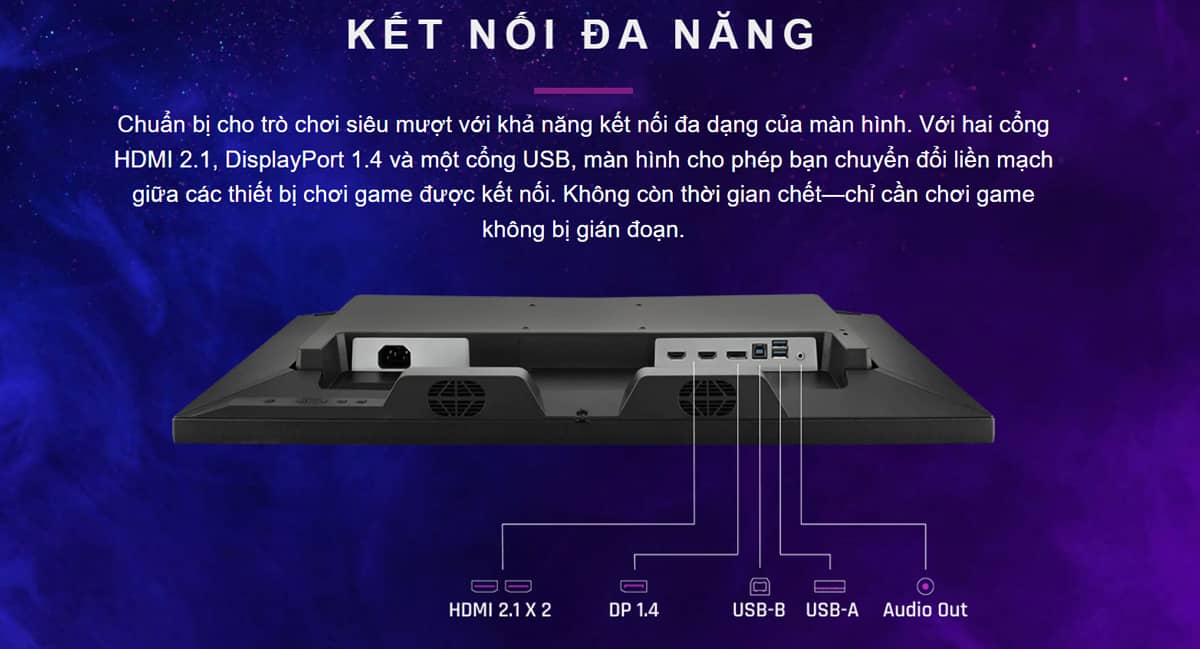 ViewSonic XG2737 được trang bị đầy đủ các cổng kết nối hiện đại với 2 cổng HDMI 2.1, 1 cổng DisplayPort 1.4, 2 cổng USB 3.2 Type-A và 1 cổng USB 3.2 Type-B. Hệ thống loa tích hợp 2x2W mang đến trải nghiệm âm thanh tiện lợi khi bạn không sử dụng tai nghe.