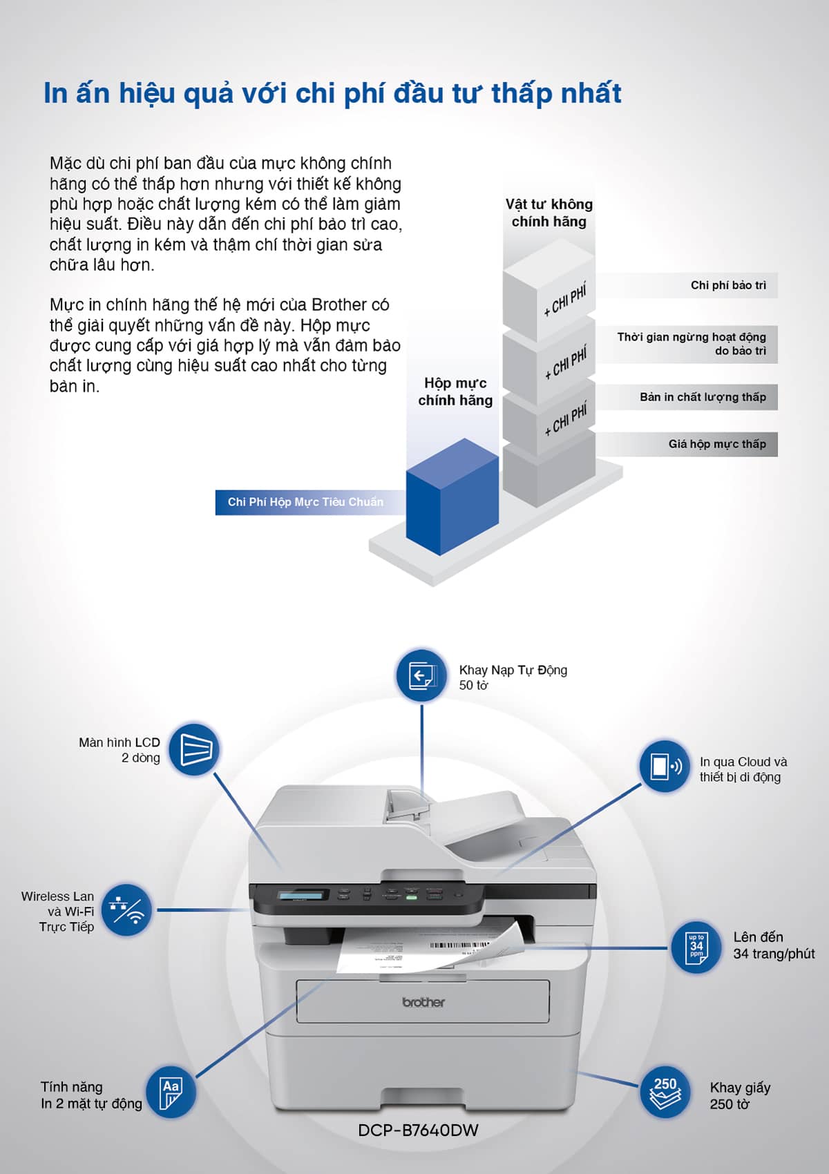Máy in laser đen trắng Brother DCP-B7640DW có thời gian khởi động nhanh cho phép máy lập tức khởi động khi nhấn nút bật nguồn, bảng hiển thị LCD 16 ký tự x 2 dòng cho khả năng giao tiếp sử dụng dễ dàng với máy in, ngoài ra máy còn giúp tiết kiệm tiêu thụ điện năng khi khởi động. Không chỉ có thiết kế nhỏ gọn mà máy còn sở hữu đầy đủ các tính năng nổi bật như In, Copy, Scan giúp bạn tiết kiệm tối ưu chi phí cũng như thời gian sử dụng