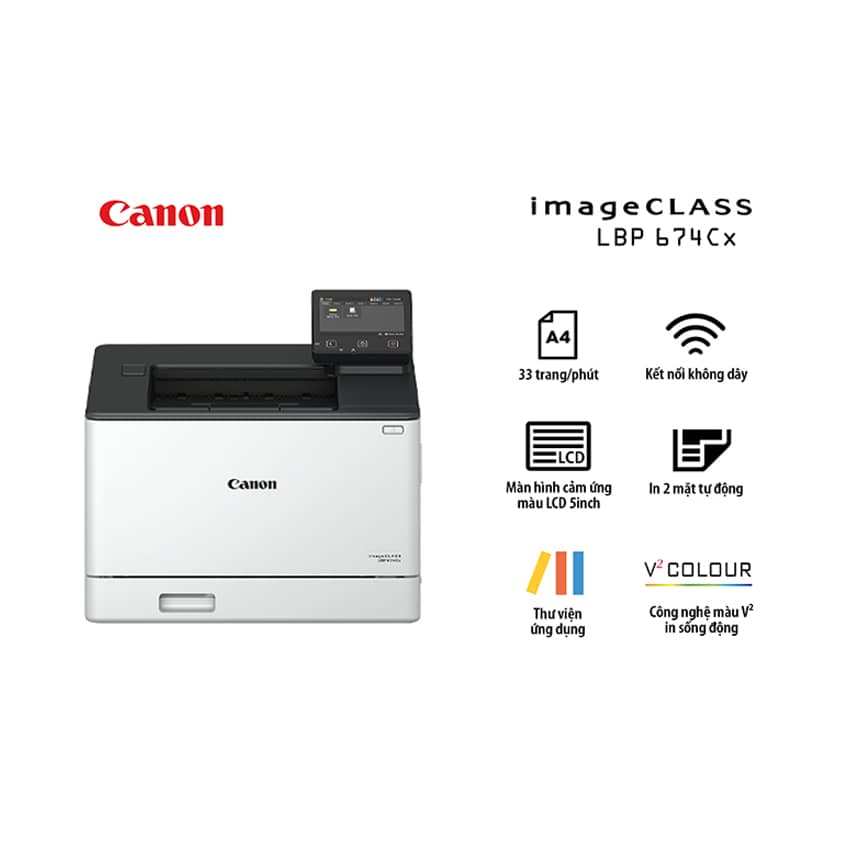 Máy in Canon LBP 674Cx Laser màu đơn năng là dòng máy in màu Canon laser đơn năng được thiết kế bền bỉ đáp ứng nhu cầu in ấn công suất lớn và tốc độ cao. Được trang bị màn hình màu cảm ứng 5 inch có thể tùy chỉnh cài đặt màn hình chính theo nhu cầu làm việc của bạn, với tính năng kéo và thả đơn giản. Máy in Canon LBP 674Cx siêu tốc hỗ trợ khả năng kết nối linh hoạt, với công nghệ màu V² để tạo ra các tài liệu có màu sắc chất lượng tuyệt vời.