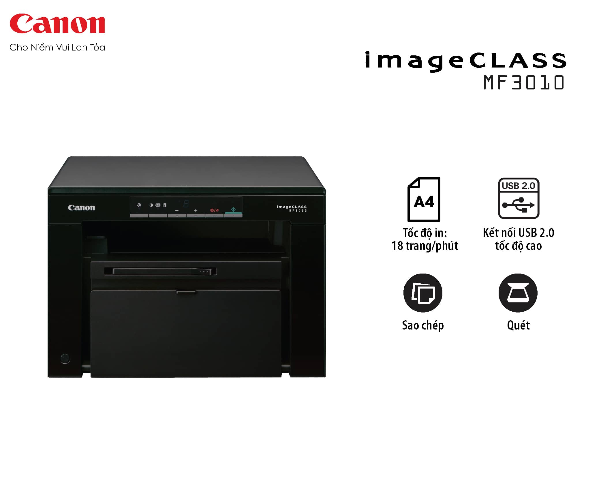 Máy in laser Canon MF3010 có khả năng in, scan, copy tiện lợi, đáp ứng được nhu cầu công việc đa dạng, tiết kiệm được diện tích và chi phí khi không phải mua nhiều máy.