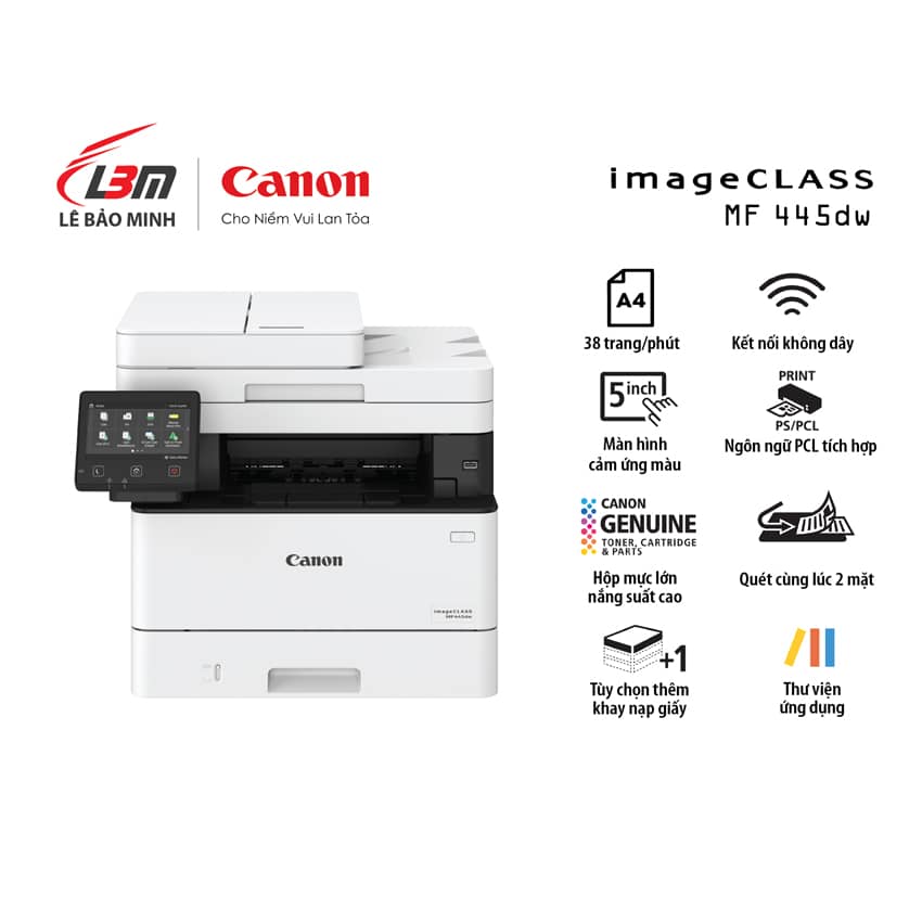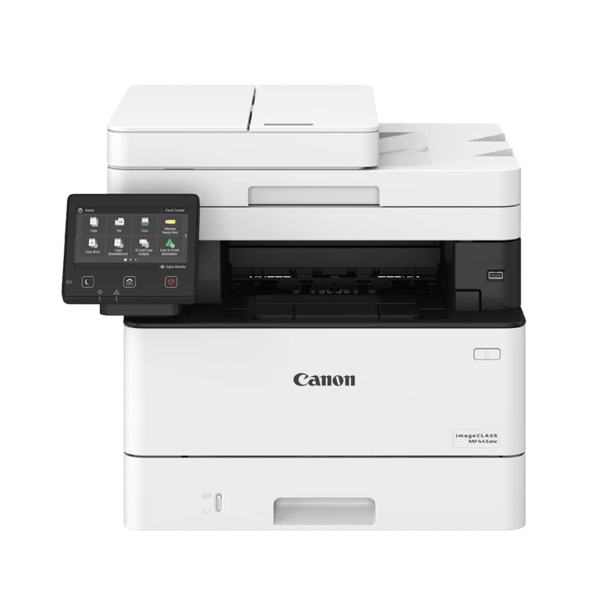 Màn hình cảm ứng màu 3,5 “trực quan, dung lượng giấy 300 trang và Quick First-Print từ lúc khởi động giúp cho các nhóm làm việc hiệu quả hơn và không bị gián đoạn. Máy In Canon MF445dw - Laser đa năng cũng cung cấp tính năng bảo mật an toàn thuận tiện ngay cả khi bạn đang in từ thiết bị di động.