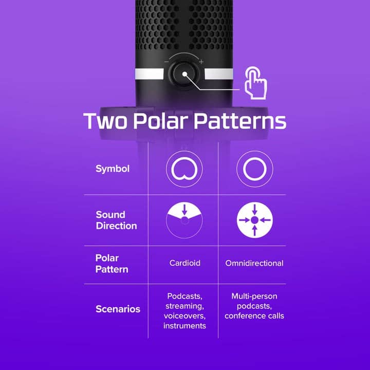 Mic thu âm HyperX DuoCast RGB sở hữu 2 loại thu âm: đơn hướng và đa hướng. Ngoài ra, bạn có thể dễ dàng chuyển đổi giữa hai tính năng này chỉ bằng một nút bấm.