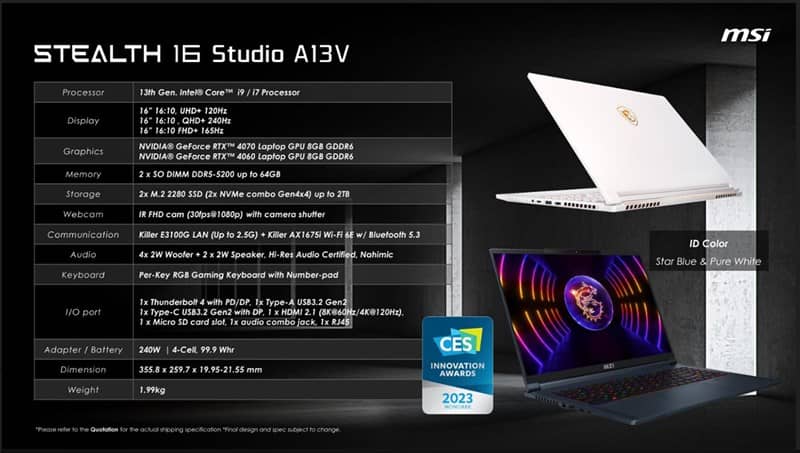 Tại CES 2023, MSI đã công bố ba mẫu máy tính xách tay dòng Stealth mới bao gồm MSI Stealth 17 Studio, Stealth 16 Studio và Stealth 14 Studio. Cả ba mẫu laptop đi kèm với thân máy bằng hợp kim magiê bóng bẩy cùng cấu hình cực kỳ mạnh mẽ.