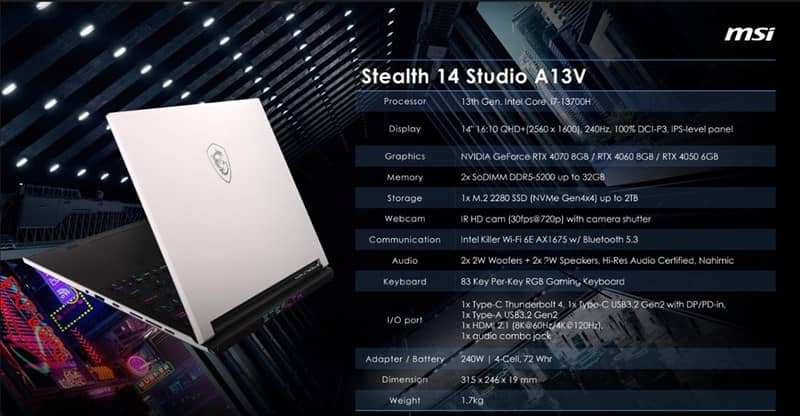 MSI Stealth 14 Studio được trang bị màn hình 14 inch độ phân giải 2.560 x 1.600 pixel, tỷ lệ khung hình 16:10 và tần số quét 240 Hz. Chiếc laptop chạy bộ vi xử lý Intel Core i7-13007H và hai tùy chọn GPU NVIDIA GeForce RTX 4070 hoặc GPU NVIDIA GeForce RTX 4060, đi kèm với 8 GB VRAM, tối đa 64 GB RAM DDR5 và dung lượng lưu trữ SSD lên đến 2 TB.