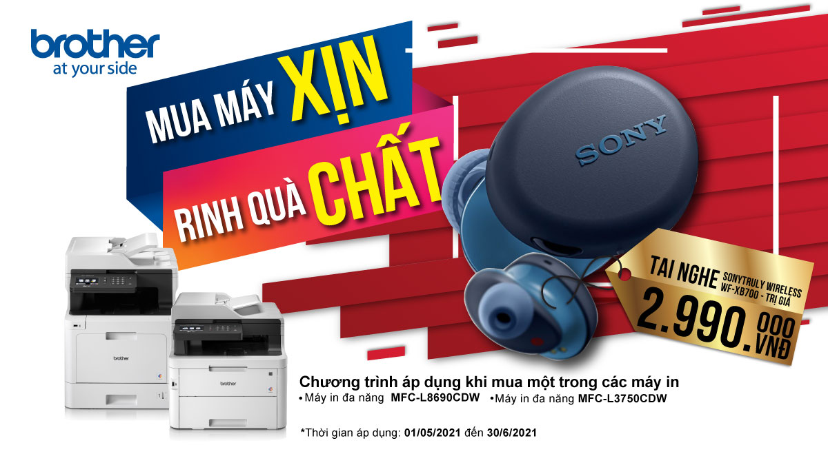 - Tặng ngay tai nghe Sony Truly Wireless WF-XB700 trị giá 2.990.000đ khi mua máy in Brother tại HACOM, áp dụng cho các sản phẩm: