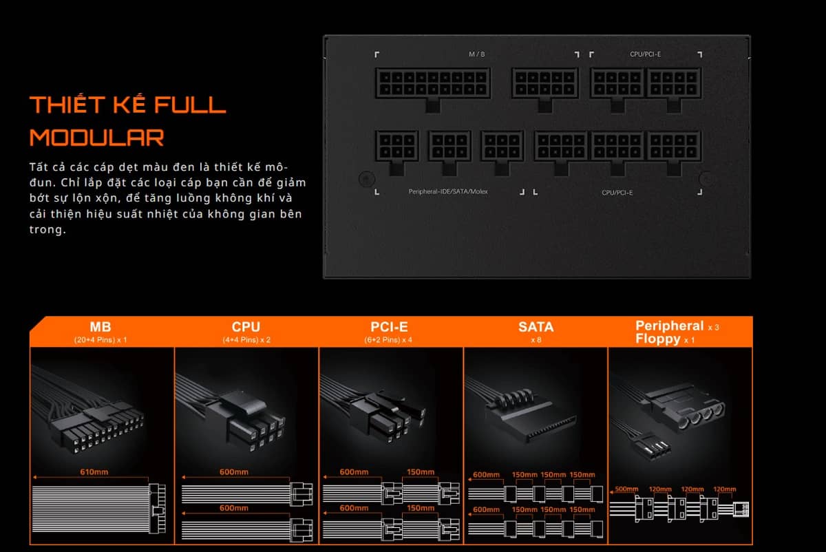 Sự khác biệt giữa một bộ nguồn phổ thông và một sản phẩm cao cấp như P750GM nằm ở thiết kế Full Modular. Thay vì một bó dây chằng chịt dính liền vào thân nguồn, Gigabyte cho phép bạn chỉ cắm những sợi dây thực sự cần thiết. Điều này mang lại lợi ích kép: về mặt thẩm mỹ, chiếc PC của bạn sẽ trở nên gọn gàng, khoe trọn được vẻ đẹp của mainboard và card đồ họa; về mặt kỹ thuật, việc loại bỏ dây thừa giúp luồng không khí bên trong thùng máy lưu thông không vật cản, hỗ trợ hạ nhiệt độ cho các linh kiện khác một cách tự nhiên và hiệu quả.