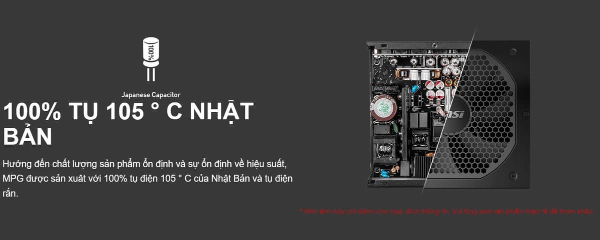 Có lẽ thông số gây sốc nhất và cũng là lời khẳng định đanh thép nhất về chất lượng của MSI chính là thời gian bảo hành lên tới 10 năm. Để đưa ra mức cam kết này, MSI đã sử dụng 100% tụ điện có nguồn gốc từ Nhật Bản - loại linh kiện nổi tiếng với khả năng chịu nhiệt độ cao lên đến 105°C và độ bền cực kỳ khắc nghiệt. Việc sở hữu MPG A850GF đồng nghĩa với việc bạn đang mua một sự "bảo hiểm" dài hạn.