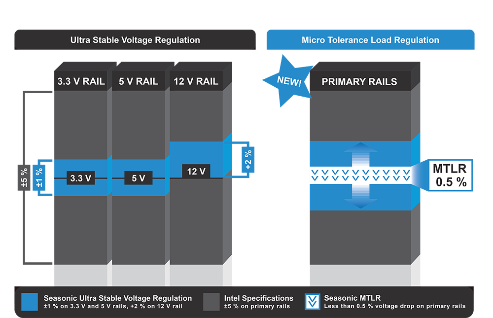 - - Thiết kế mới nhất của Seasonic cho điện áp đầu ra trong một phạm vi rất chặt chẽ, đạt được quy định tải dưới 0,5% (1% cho 1000 W trở lên)