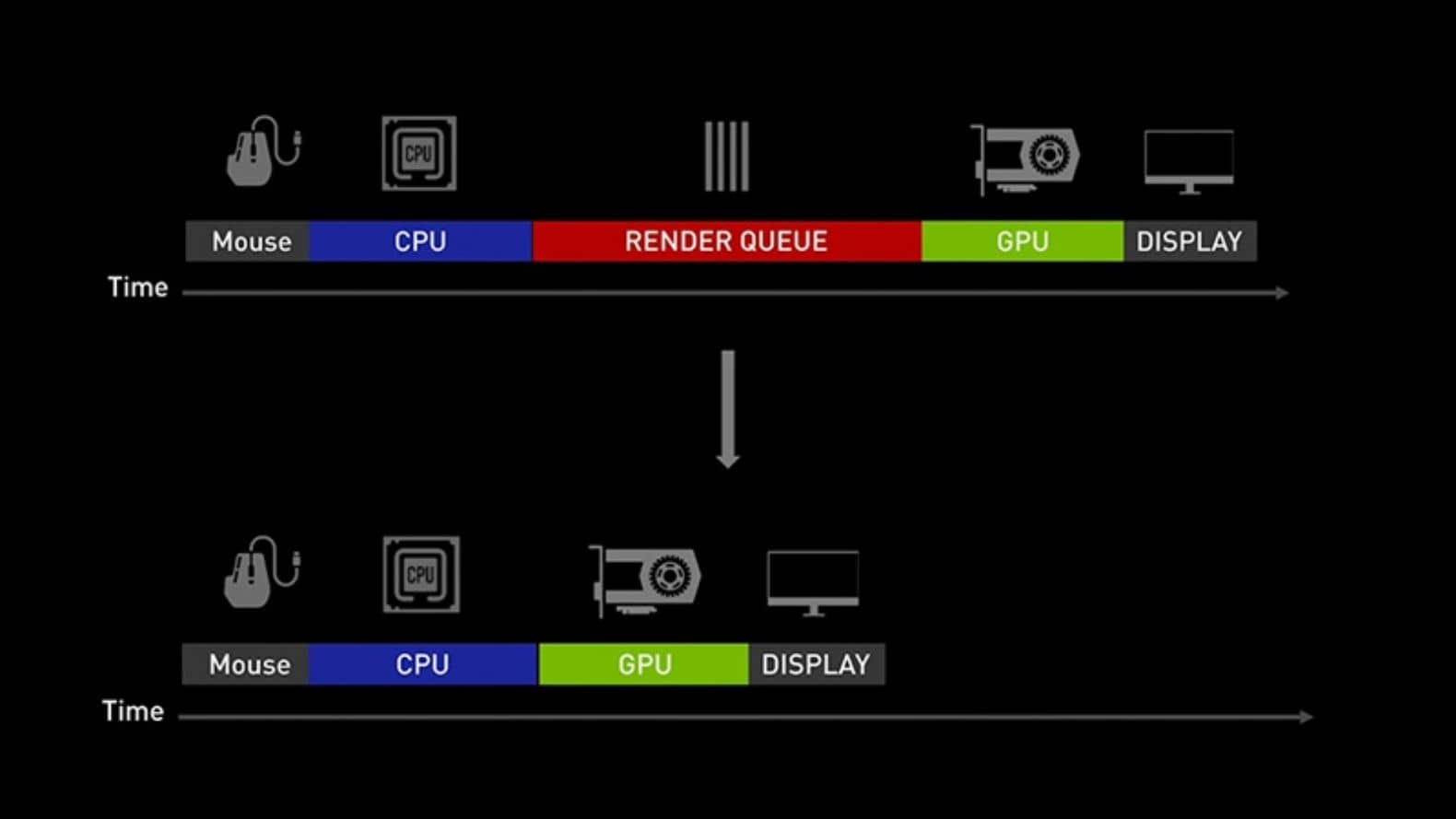 Trong các hệ thống đồ họa truyền thống, để GPU luôn hoạt động hết công suất, CPU có xu hướng chuẩn bị sẵn một vài khung hình và đưa chúng vào một hàng đợi chờ GPU xử lý. Tuy nhiên, nếu hàng đợi render quá dài, thao tác mới phải xếp hàng phía sau các khung hình cũ sẽ tạo ra độ trễ không mong muốn.