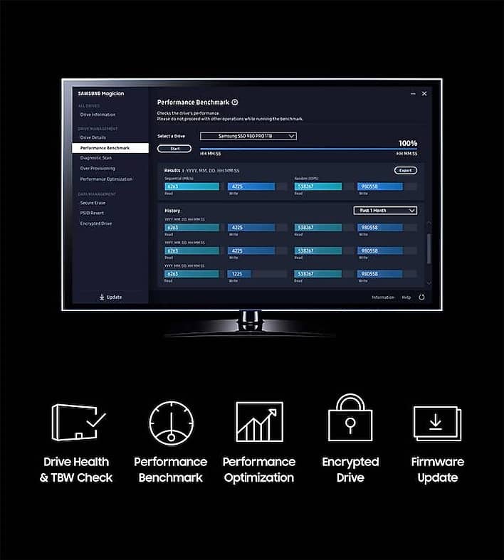 Ổ cứng SSD Samsung 980 PRO with Heatsink PCIe NVMe M.2 2280 V-NAND đi kèm với phần mềm Samsung Magician miễn phí có thể tải về trên trang chủ, cho phép bạn dễ dàng theo dõi, quản lý và duy trì hiệu năng SSD của bạn. Magician giúp đảm bảo rằng các Firrmware mới nhất luôn được cập nhật và cung cấp một loạt các chức năng bổ sung cho phép bạn điều chỉnh các thiết lập phù hợp nhất với cách sử dụng của bạn.