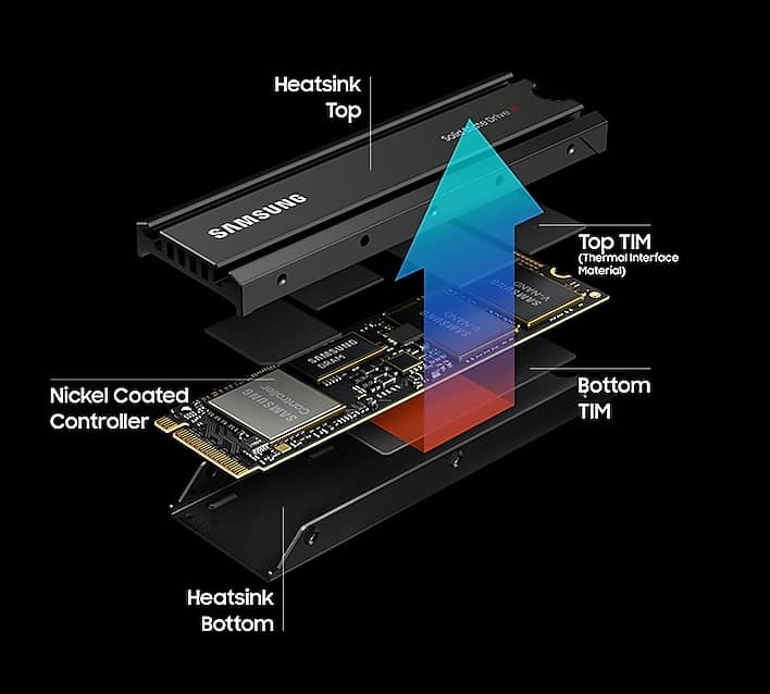 Đối với các dòng SSD có hiệu suất cao thường phải được trang bị tính năng kiểm soát nhiệt độ với độ tin cậy cao. Để đảm bảo hiệu suất ổn định, ổ cứng SSD Samsung 980 PRO with Heatsink PCIe NVMe M.2 2280 V-NAND sử dụng lớp bọc Niken cho Controller và Heatsink phía mặt lưng của SSD để mang đế khả năng giải nhiệt hiệu quả cho Controller và các chip NAND.