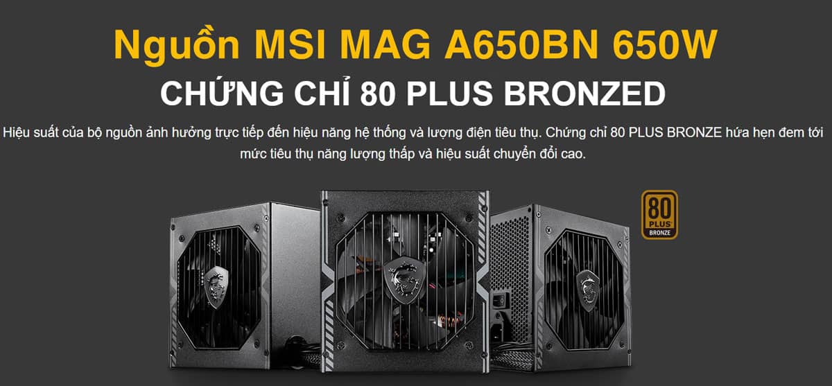 Bộ nguồn này có công suất 650W, thiết kế bo mạch DC-DC và quạt tản nhiệt 120mm giúp giảm tiếng ồn. Ngoài ra, nó còn được trang bị các cơ chế bảo vệ như OCP, OVP, OPP, OTP và SCP, đảm bảo an toàn cho hệ thống của bạn. Với thiết kế chắc chắn và hiệu suất ổn định, MSI MAG A650BN là một sự lựa chọn đáng tin cậy cho mọi cấu hình máy tính.