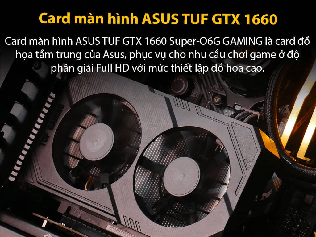 Card màn hình ASUS TUF GTX 1660 Super-O6G GAMING là card đồ họa tầm trung của Asus, phục vụ cho nhu cầu chơi game ở độ phân giải Full HD với mức thiết lập đồ họa cao.