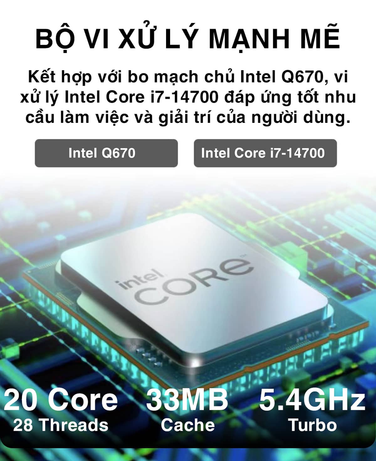Sở hữu bộ vi xử lý Intel Core i7-14700 thế hệ 14 mạnh mẽ, HP AW1F6PT dễ dàng xử lý đa nhiệm mượt mà, cho phép bạn làm việc với nhiều ứng dụng cùng lúc mà không gặp phải tình trạng giật lag. Với 20 nhân và 28 luồng xử lý, cùng tần số xung nhịp lên đến 5.4GHz, máy đáp ứng tốt mọi nhu cầu làm việc và giải trí, từ các tác vụ văn phòng đến chỉnh sửa đồ họa và video.