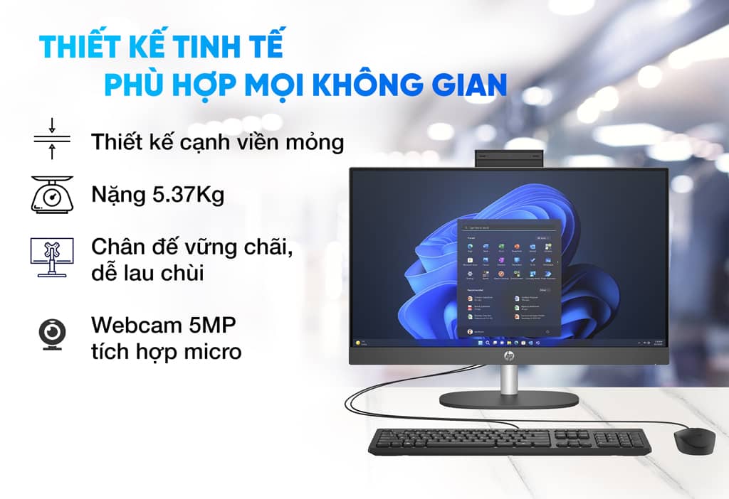 Không những thế còn tăng tính thẩm mỹ cho góc máy của người dùng trở nên hiện đại, sang trọng hơn. HP đã trang bị cho AIO ProOne 240 G10 cụm viền màn hình siêu mỏng. Cạnh dưới cùng được tích hợp dải loa, vô cùng gọn gàng đẹp mắt với công suất ở mức đủ dùng. Trang bị sẵn camera 5MP và Micro giúp bạn liên lạc, gọi video, tham gia họp trực tuyến với bạn bè, người thân, đồng nghiệp một cách dễ dàng qua các ứng dụng Zalo, Google Meet, Zoom,..