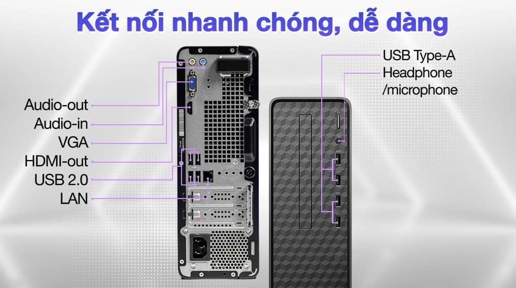 PC HP S01-pF2035d tich hợp các cổng kết nối tiêu chuẩn thường thấy ở các bộ máy đồng bộ hãng: DisplayPort, HDMI, RJ-45, USB,....Người dùng có thể kết nối với các thiết bị ngoại vị khác.