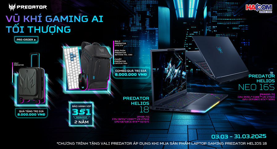 Với Predator Helios 18 AI, combo quà tặng còn ấn tượng hơn với tổng giá trị lên đến 16.000.000 VNĐ, bao gồm tất cả các phụ kiện trên cùng món quà đặc biệt Vali Predator trị giá 8.000.000 VNĐ, sang trọng, tiện dụng và đậm chất gaming.
