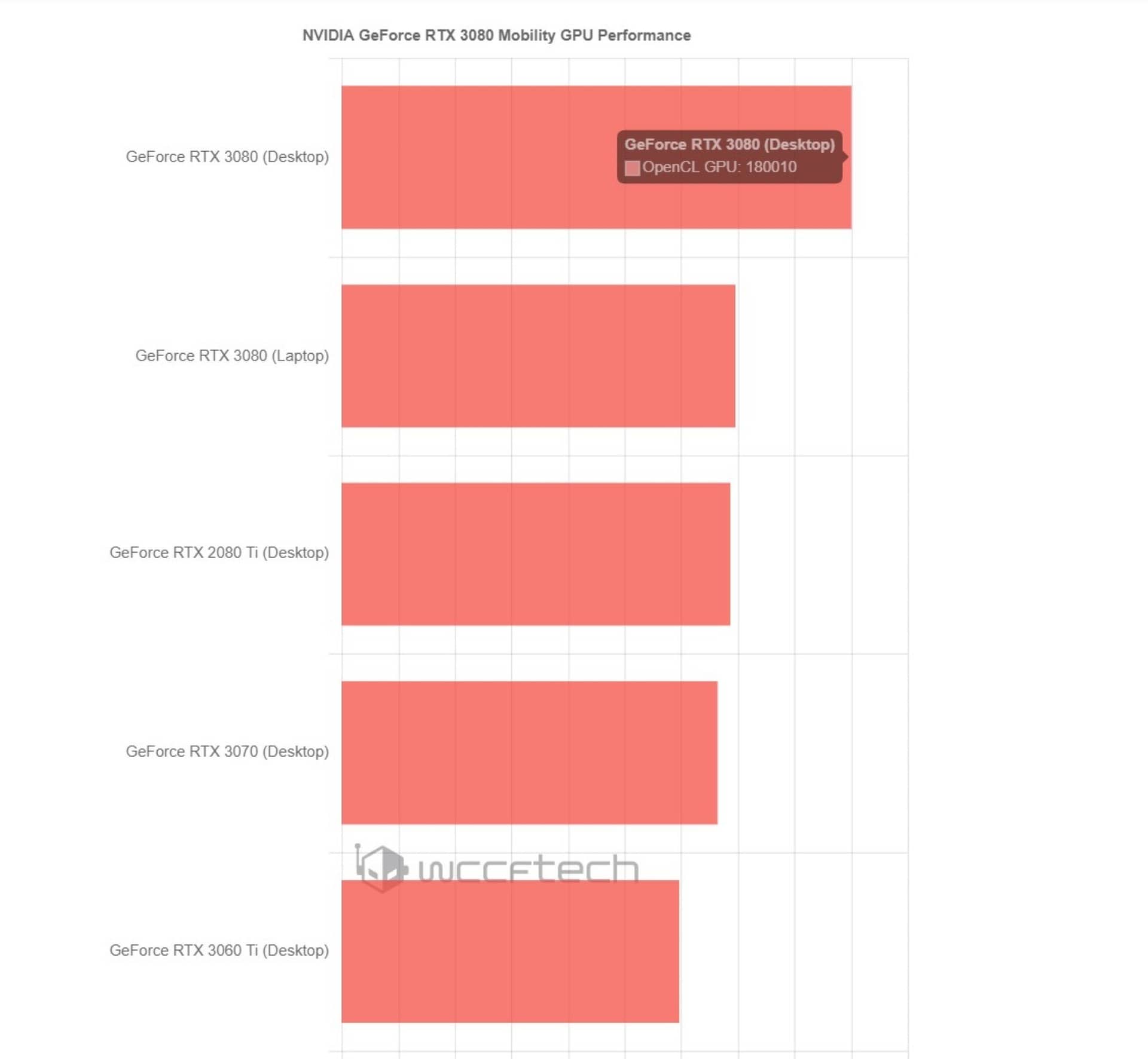 RTX 3080 và RTX 3070 về cơ bản đều dùng con GA104 - cùng một con GPU của RTX 3060 Ti và RTX 3070 trên card đồ họa cho desktop. Phiên bản RTX 3080 cho laptop được giữ nguyên 48 SM, nhiều hơn 46 SM của GA104 trên RTX 3070 desktop và như vậy nó cho 6144 nhân CUDA, 48 nhân Ray Tracing và 192 nhân Tensor. Tuy nhiên xung nhịp của nó sẽ thấp hơn so với phiên bản GA104 trên desktop bởi giới hạn về TGP. Phiên bản RTX 3080 Max-Q sẽ có TGP từ 80 đến 90 W, xung tối đa của nó sẽ đạt tầm 1365 MHz và hiệu năng FP32 ở 15,30 TFLOPS. Trong khi đó phiên bản RTX 3080 Max-P với TGP lên đến 150 W sẽ có thể đạt mức xung đến 1710 MHz, hiệu năng FP32 ở 18,98 TFLOPS, như vậy hiệu năng của Max-P sẽ cao hơn Max-Q tầm 24% và RTX 3080 Max-P chỉ thua RTX 3070 trên máy bàn khoảng 7% nếu những thông số này chính xác.