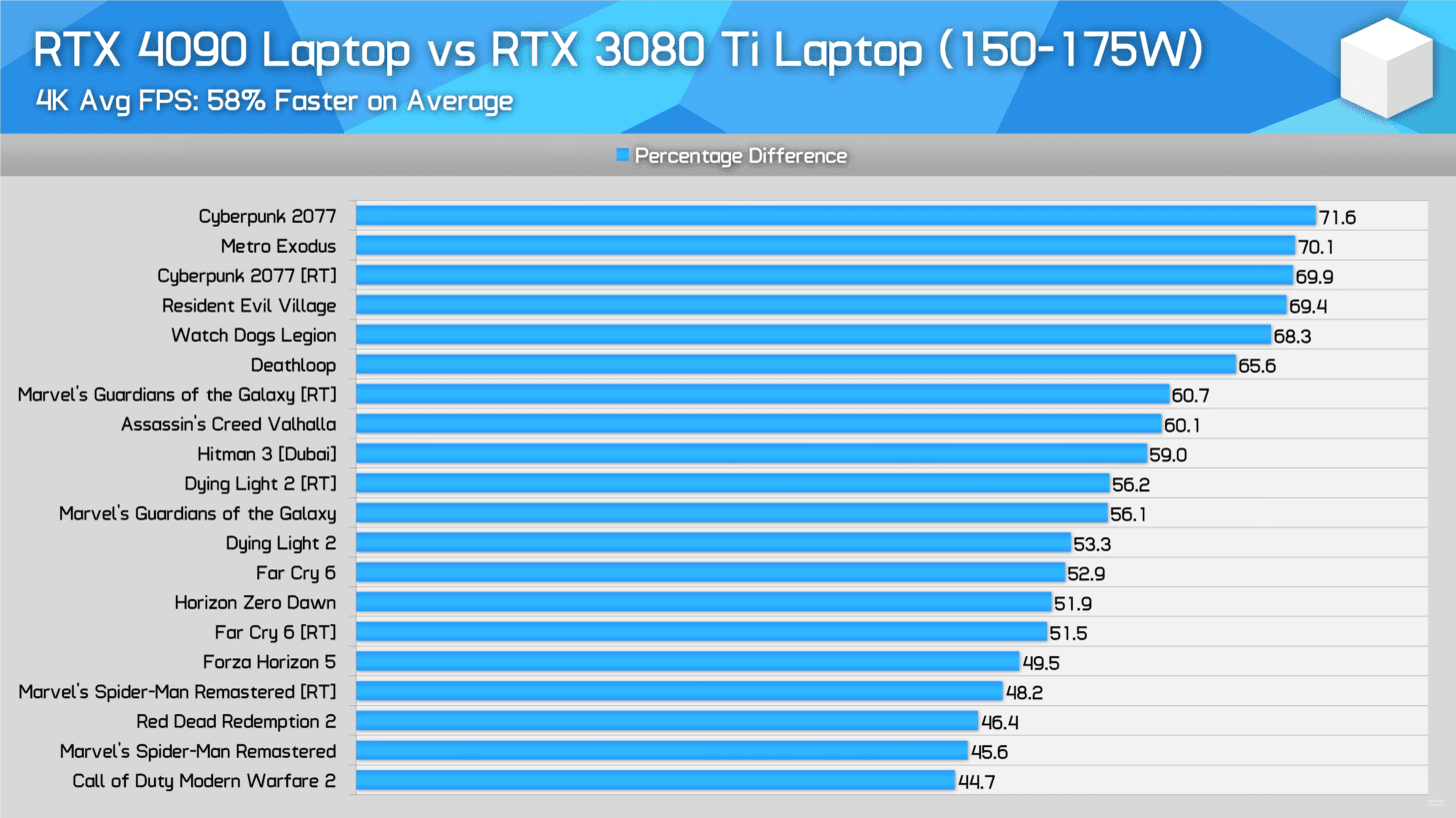 Kênh HardwareUnboxed đánh giá chiếc MSI Titan GT77, và đưa ra số liệu tổng kết hiệu năng xử lý game ở độ phân giải 4K. Qua đó, sức mạnh của RTX 4090 laptop trung bình mạnh hơn RTX 3080 Ti laptop khoảng 58%. Điều đáng nói ở đây là HardwareUnboxed chưa hề đề cập đến sức mạnh của DLSS 3, phiên bản công nghệ nâng cấp hình ảnh dành riêng cho RTX 40 series, mà mới chỉ so sánh sức mạnh xử lý đồ hoạ thô của card: