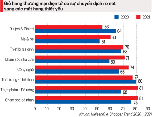 Trải qua hai năm đại dịch Covid-19, xu hướng chi tiêu của người dân Việt Nam đã có sự thay đổi lớn. Theo NielsenIQ Việt Nam, năm 2021 là một bước biến chuyển thành công dành cho ngành hàng công nghệ, các sản phẩm về công nghệ, thương mại điện tử có sự tăng trưởng mạnh , trong khi các nhu cầu mua sắm ưu tiên của người Việt trước đó như du lịch, mua sắm, vui chơi giải trí đều có sự giảm rõ rệt do ảnh hưởng của dịch bệnh.