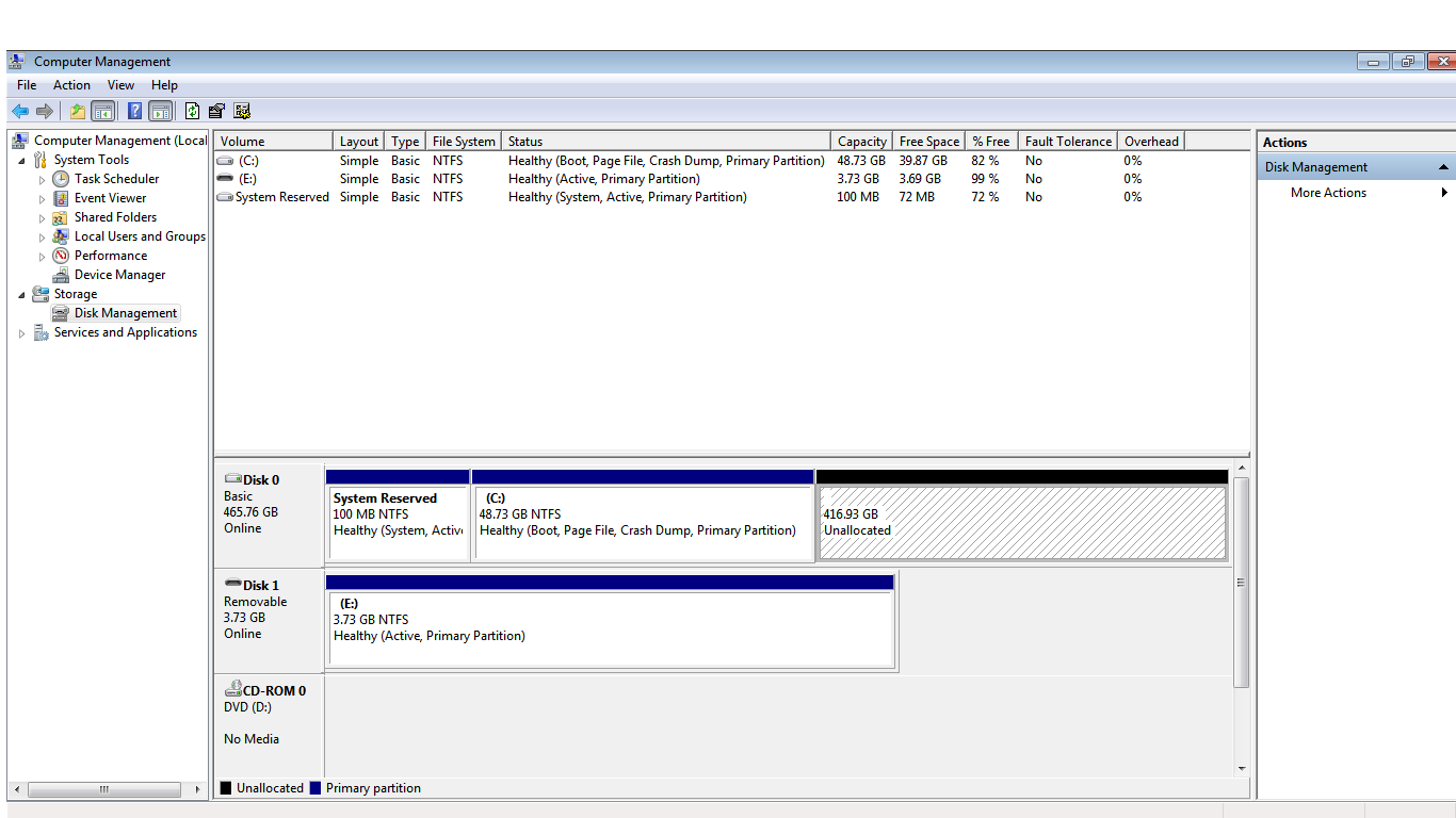Như hình ở trên bạn có thể thấy, ngoài phân vùng ổ cứng hệ thống là ổ C, phần 416Gb còn lại của ổ cứng chưa được khởi tạo do vậy khi sử dụng bạn chỉ có thể nhìn thấy ổ C với dung lượng 48Gb.