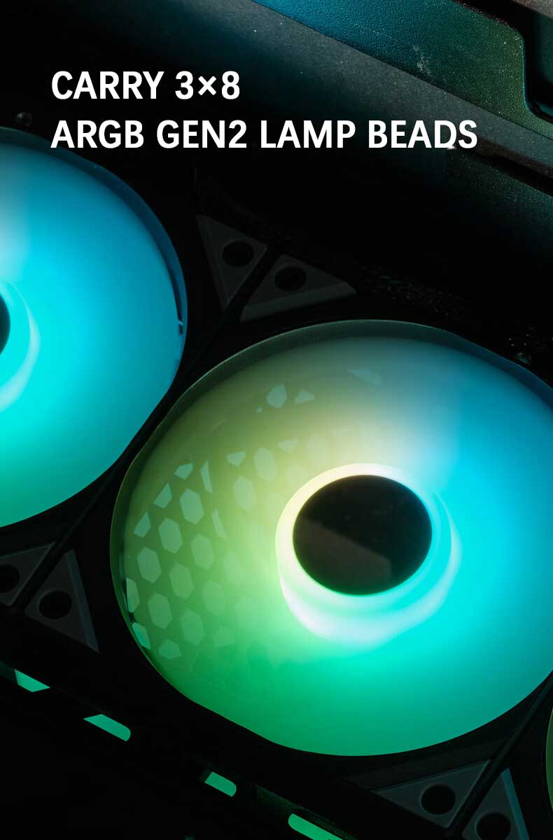 - Quạt tích hợp ARGB GEN2 LEDs với công nghệ Fluid Dynamic 8earing (FDB) technology tăng độ bền và cho phép người dùng tùy chỉnh hiệu ứng ánh sáng.