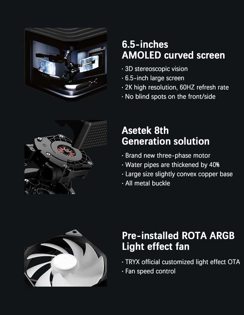 - Bơm Asetek thế hệ thứ 8 mới nhất có động cơ 3 pha mang lại hiệu suất làm mát tối ưu, lưu lượng cao hơn và trở kháng thấp hơn cũng như giảm tiếng ồn.
