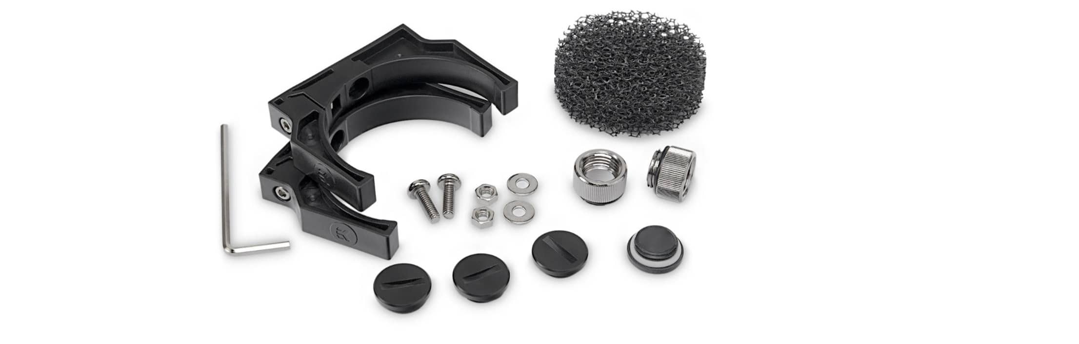 - Bộ gông bắt tank- 2 × Fit G1/4 extenders- 4 × Fit G1/4 Plugs- 1 × 6mm Allen để vặn Fit Plugs- 1 × 2,5mm allen để vặn ốc gông giữ tank- 1 × Tấm chống bọt