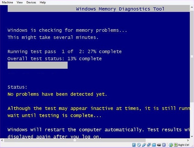 Lúc này máy tính của bạn sẽ khởi động lại và công cụ Windows Memory Diagnostic Tool bắt đầu được kích hoạt và bắt đầu kiểm tra xem có lỗi RAM không. Bạn cầ đợi một khoảng thời gian để chương trình làm việc.