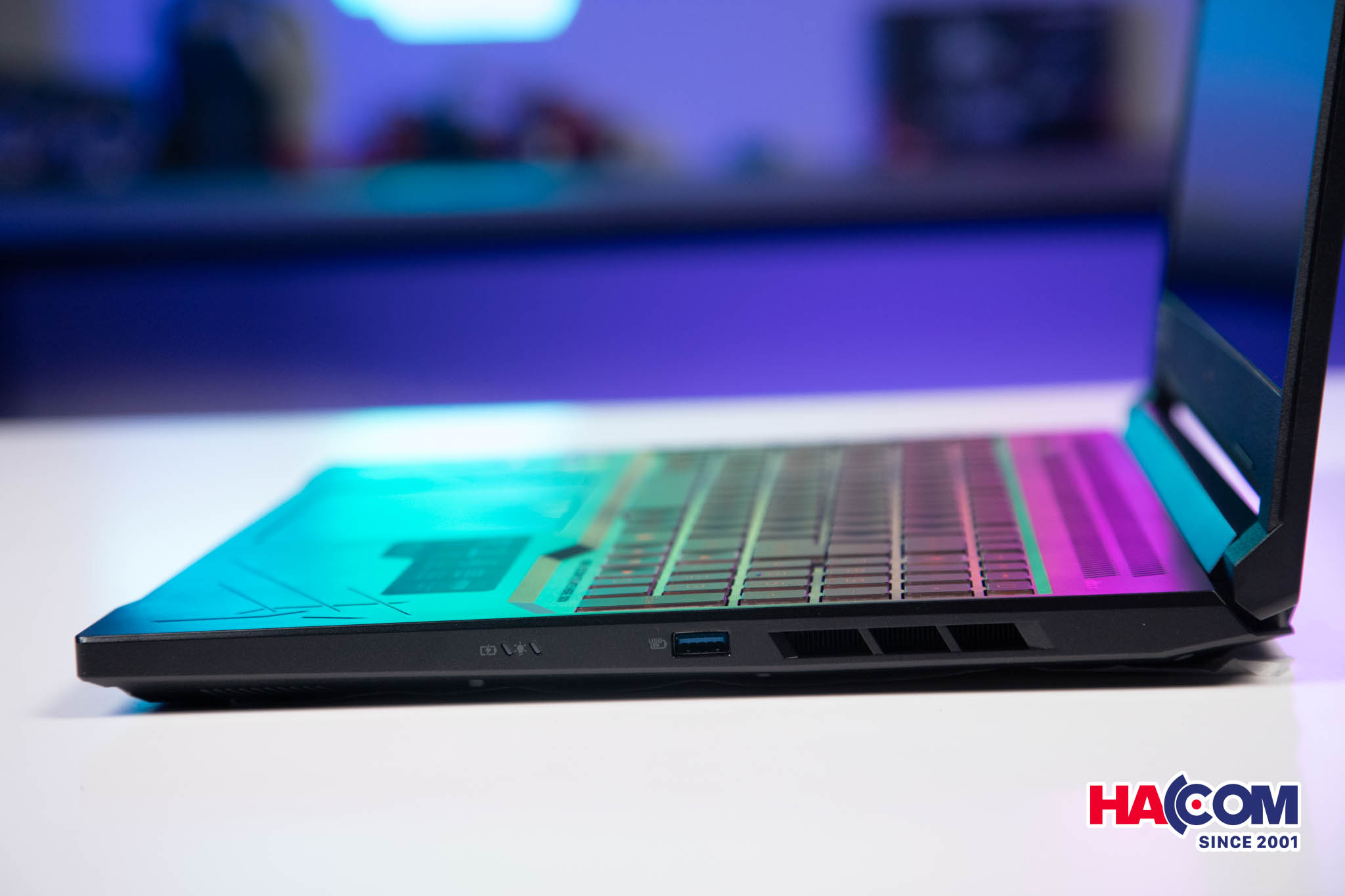 Pin 4 cell 57Wh cho thời gian sử dụng thực tế khoảng 3-4 tiếng với tác vụ hỗn hợp, đủ để bạn làm việc hoặc giải trí khi không tiện cắm sạc. Bàn phím LED nền màu cam, hành trình phím sâu, tạo cảm giác gõ chắc chắn, hỗ trợ tốt cho cả game thủ lẫn người dùng văn phòng.