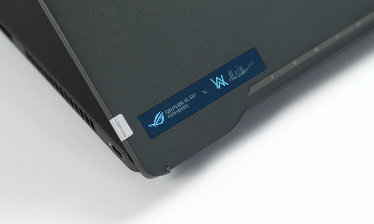 Khu vực góc trái của máy có logo của ROG cùng biểu tượng và chữ ký của nghệ sĩ. Phần vỏ laptop dùng chất liệu hợp kim nhôm-magie cho độ bền cao, cũng như giảm bám vân tay trên bề mặt.