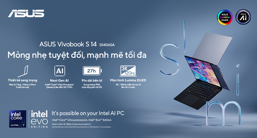 ASUS Vivobook S 14 S5406: Laptop AI Mỏng Nhẹ, Mạnh, Pin Lâu Vô Cùng