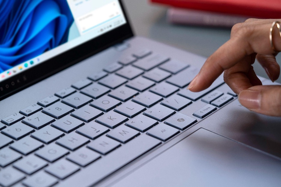 Bàn phím ErgoSense thời trang và thoải mái được trang bị đèn nền RGB một vùng tùy chỉnh dễ dàng trong ứng dụng My ASUS, cùng với bàn di chuột ErgoSense lớn, hỗ trợ các cử chỉ thông minh.