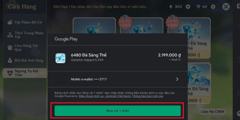 Bước 2: Khi xuất hiện giao diện mới, ấn chọn “Cửa hàng”, sau đó chọn giá nạp Genshin Impact, chọn xác nhận thanh toán là hoàn thành.