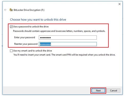 Bước 2: Sau khi quá trình khởi tạo nền BitLocker được hoàn tất, một cửa sổ thiết lập mật khẩu được hiện lên. Trong đó, bạn tích vào ô Use a password to unlock the drive để xác nhận dùng mật khẩu mở khóa BitLocker.