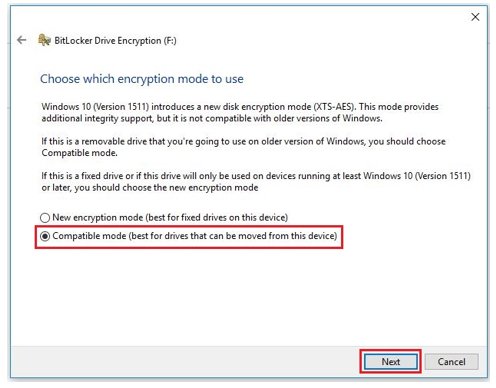Nếu dự định sử dụng ổ được mã hóa trên các nền tảng Windows cũ trước Window 10, hãy chọn Compatible mode.