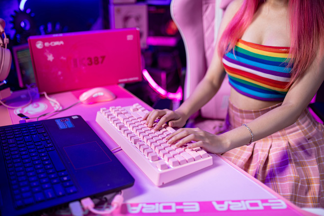Để trang trí cho dàn pc màu hồng không thể thiếu trên bàn một chiếc keyboard màu hồng. Dù chỉ hơn 500 nghìn đồng, bàn phím EK387 vẫn có độ hoàn thiện cao, liền mạch, tốt hơn hẳn so với các loại phím cơ khác trong phân khúc. Đặc biệt keycap siêu bền màu hồng phấn dễ dàng chinh phục trái tim thiếu nữ.