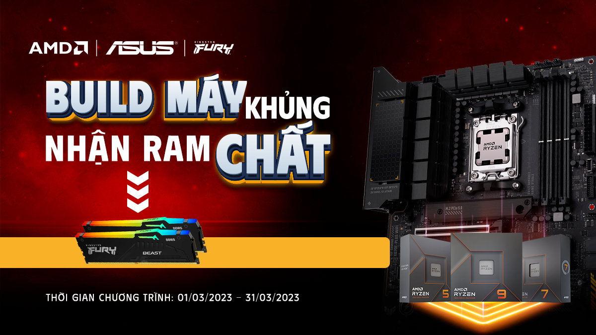 Khi khách hàng Build PC sử dụng Combo CPU AMD Ryzen 7000 series và mainboard ASUS tuỳ theo mã sản phẩm sẽ nhận được quà tặng là RAM Kingston tương ứng như sau: